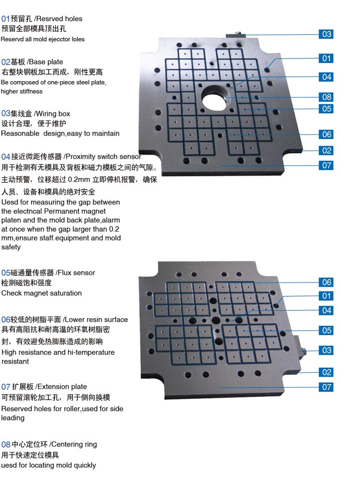 1. 数控机床及加工中心用:棋格型和条形电永磁吸盘