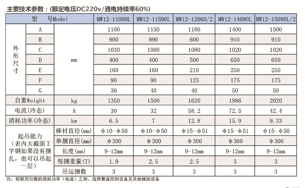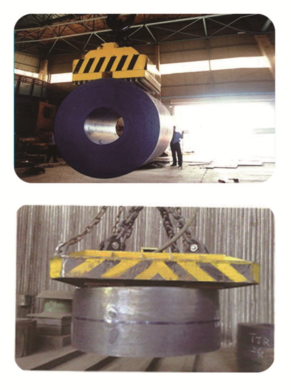 MW12吊钢带起重电磁铁 产品介绍:主要用于冷轧和热轧板厂吊装各类钢卷。 适用于吸掉钢带卷(600℃以内使用),分为垂直吊运型和水平吊运型。和传统的钢带卷吊具比较,钢带卷用起重电磁铁更加安全可靠,而且不对对钢带卷表面产生任何伤痕。