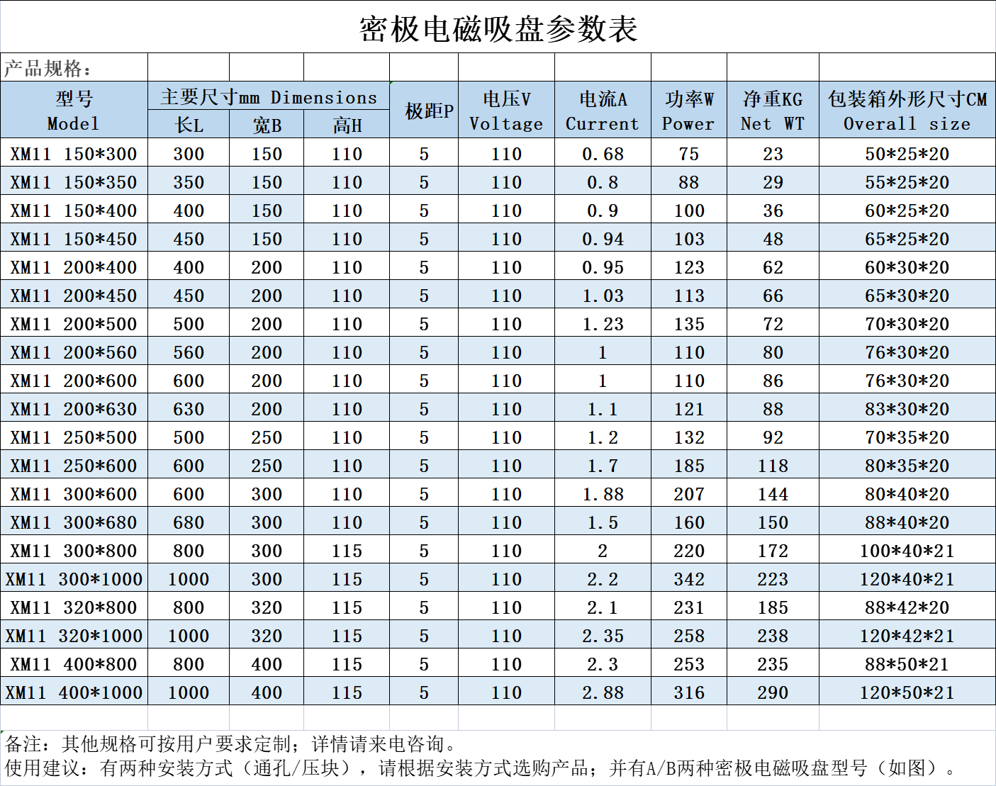 使用建议:当用户选购产品使用时,可以选购 横向密极电磁吸盘 和 纵向密极电磁吸盘 。