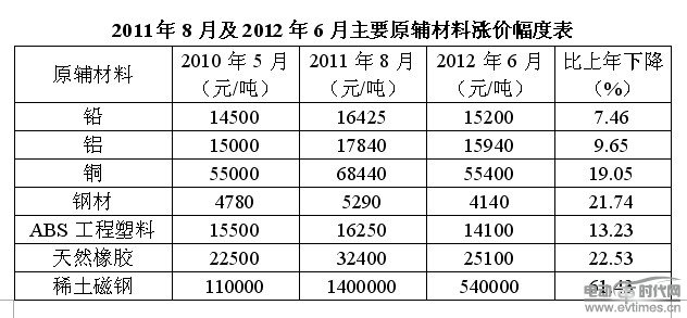 在6月8日刚刚结束的江苏协会五届五次理事会议上,江苏省自行车电动车协会理事长陆金龙指出,虽然不提倡电动车行业的价格战,但从外部环境看,价格战的环境已经形成。从去年8月份至今年6月影响电动车成本的铅、铝、铜、钢材价格分别下跌7.46%、9.65%、19.05%、21.74%,ABS工程塑料、天然橡胶价格分别下跌13.23%、22.53%,稀土磁钢价格下跌61.43%。