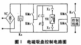 图中VC为整泷装置;KM5、KM6为两台接触器的主触头;RC为放电回路;YH为电磁吸盘线罔;X2为插接器;KA为欠电压继电器。