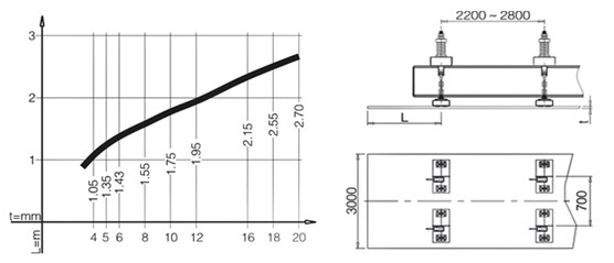 不同板厚联吊时最外端的起重电永磁铁允许伸出的钢板长度见下图